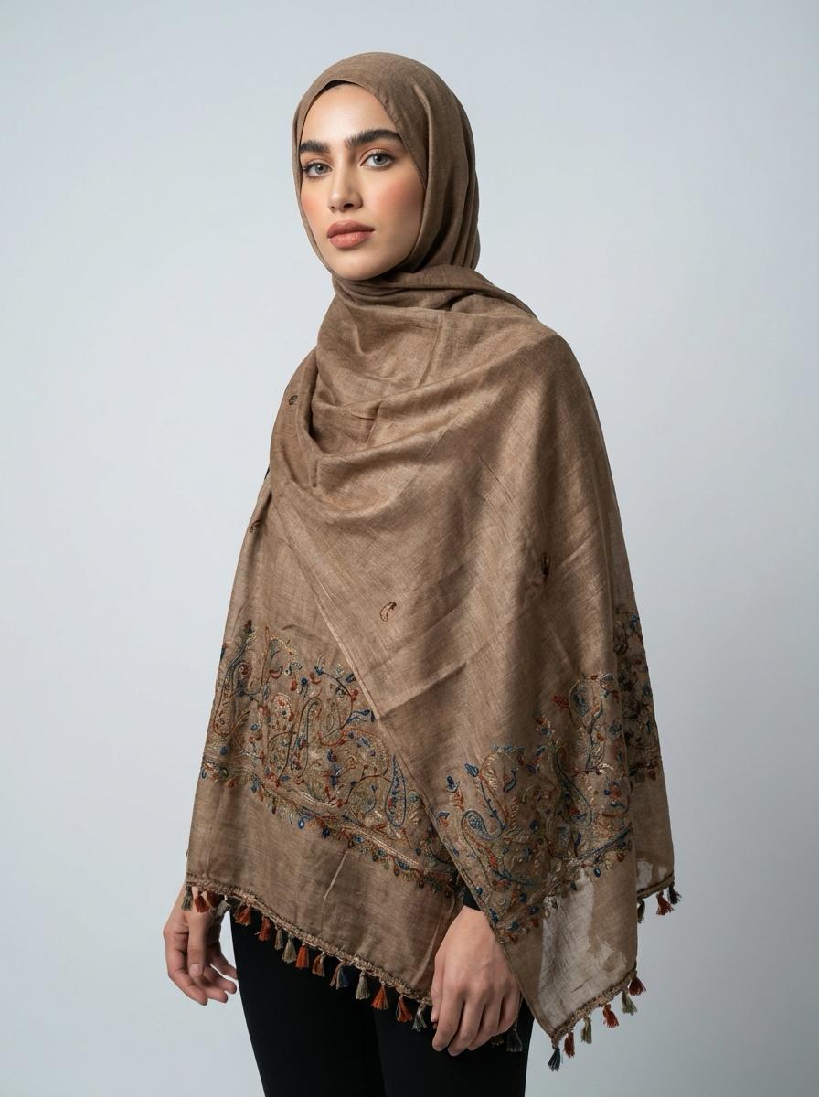 Açık kahve tonlarıyla doğal bir görünüm sunan bu şal, nakış detaylarıyla şıklığa zarafet katıyor. Özel nakış işlemeleri, şalın her bir kıvrımında göz alıcı bir hava yaratırken, uçlarındaki püsküller de hareket katıyor. Bu şal, aynı zamanda farklı şekillerde sarılabilmesi sayesinde pratik bir kullanım sunar. İster bohem bir tarzla isterseniz de klasik bir şıklıkla kombinleyebilirsiniz.