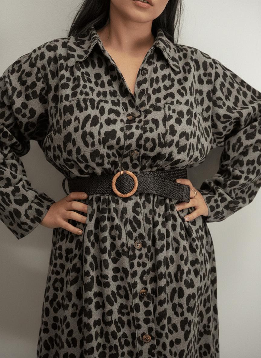 Gri tonlarının asil duruşu ile hareketli leopar deseninin mükemmel uyumunu sunan bu elbise, rahatlığı ve zarafeti aynı anda arayan kadınlar için ideal bir tercihtir.