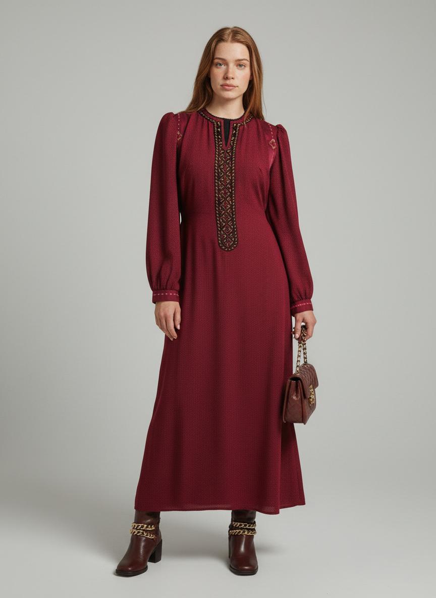 Mira Bordo Nakış Detaylı Uzun Kadın Elbise