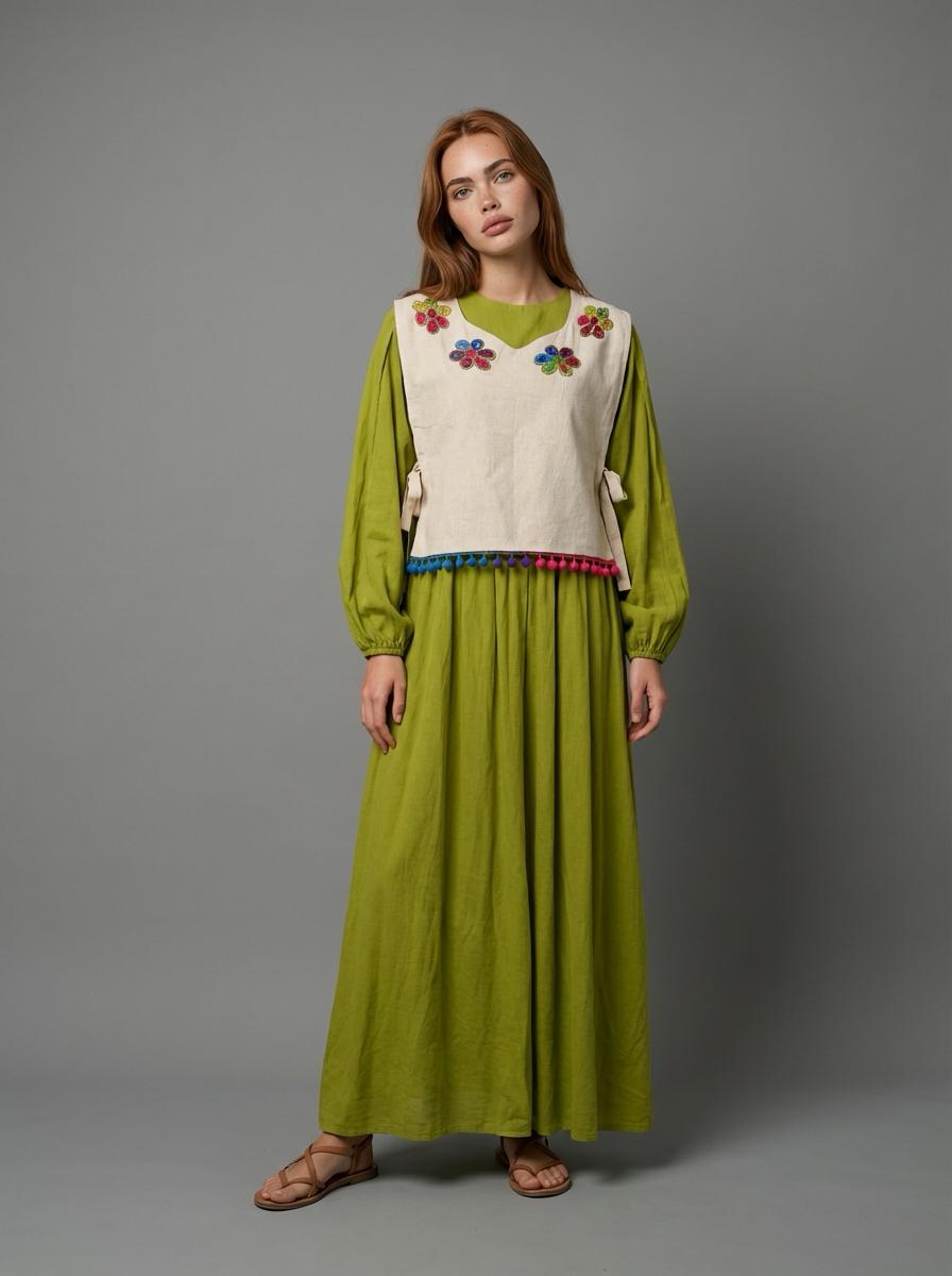 Bohem ve zarif detayların buluştuğu Mira Nakışlı Yandan Bağlamalı Kadın Süveter, kombinlere karakter kazandıran özel bir tasarımdır. Doğal tonlardaki dokusu, ön kısmındaki renkli çiçek nakışları ve etek ucundaki ponpon detaylarıyla dikkat çeker.
