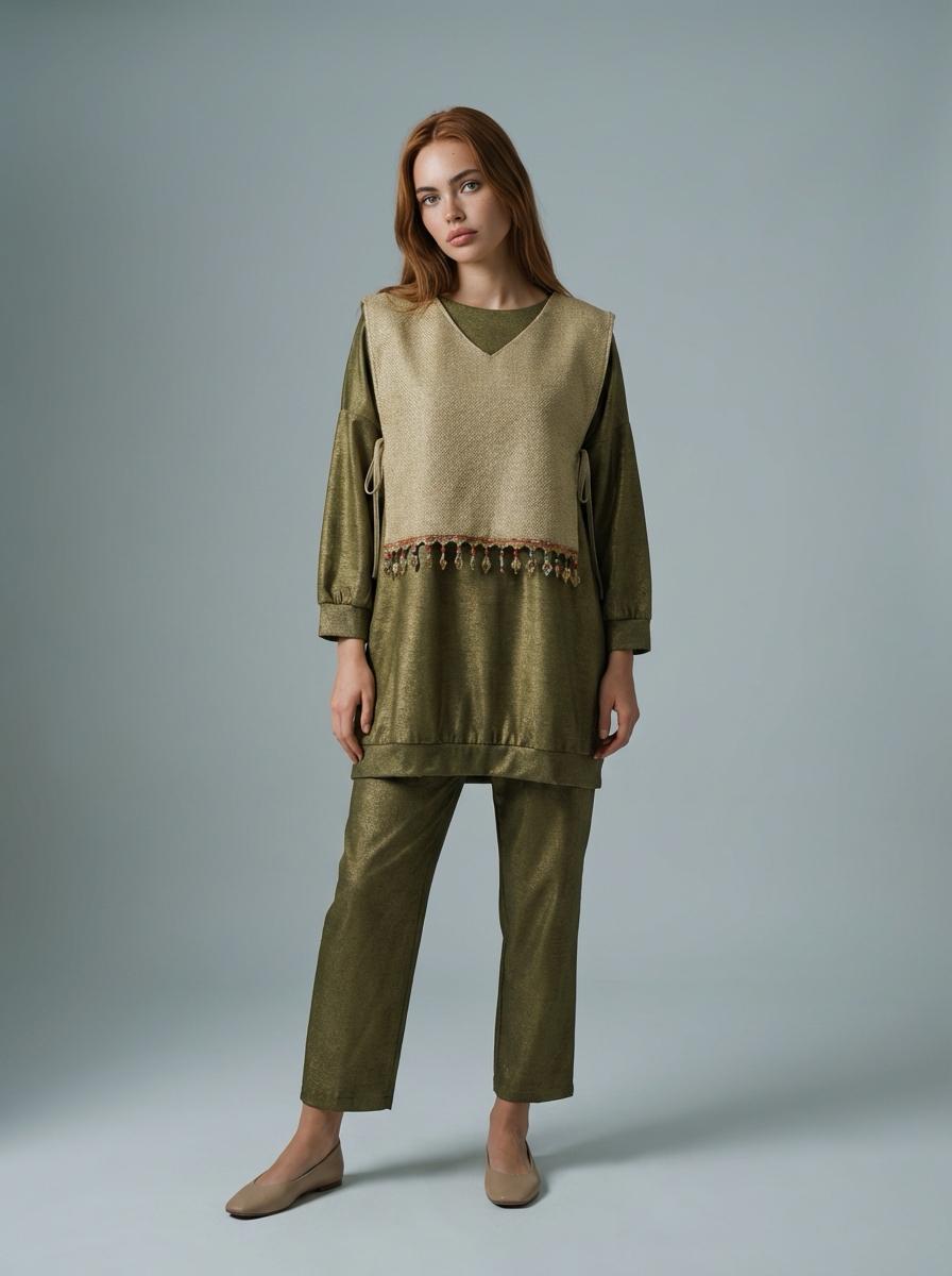 Yandan bağlamalı tasarımı ve altın tonlu dokusuyla öne çıkan bu süveter, modern ve özgün bir stil sunar. Rahat kalıbı sayesinde gün boyu konfor sağlarken, şık duruşu ile günlük kombinlerden özel davetlere kadar geniş bir kullanım alanı sunar.