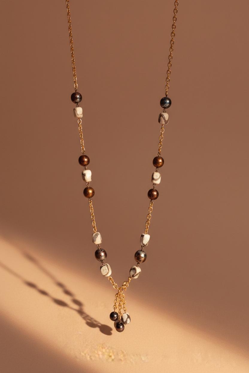- Malzeme: Kolye, doğal taşlar ve yüksek kalite metal zincir ile üretilmiştir. Doğal taşların mineralleri ve benzersiz yapıları sayesinde her bir parça kendine has bir görünüme sahiptir.